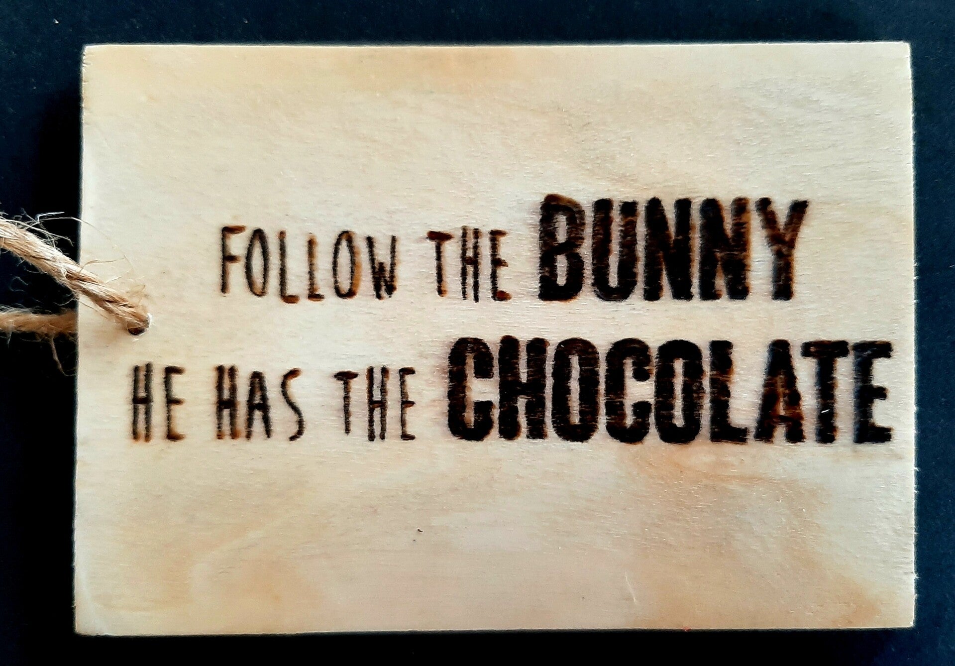 Extra grote kadolabel van hout, met daarop een afbeelding/tekst gebrand in het thema pasen.