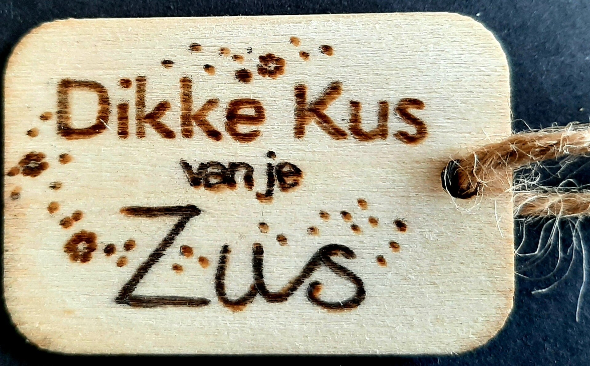 Kadolabel van hout, met daarop een tekst en/of afbeelding gebrand.