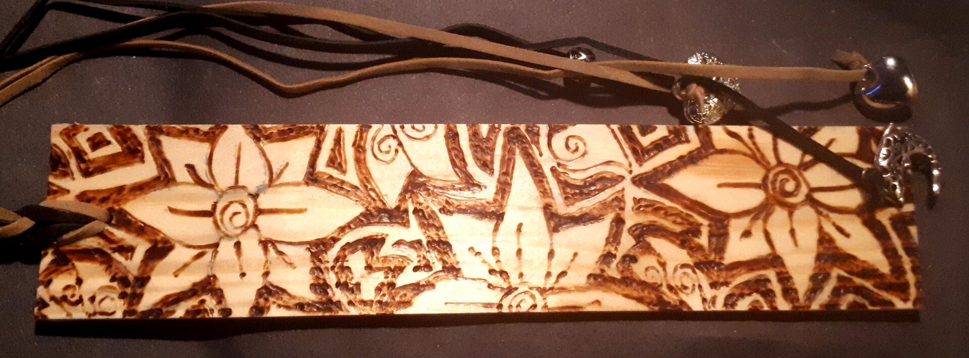Afmeting ca 4 x 20 cm . Afbeelding en tekst zijn gebrand op het hout.