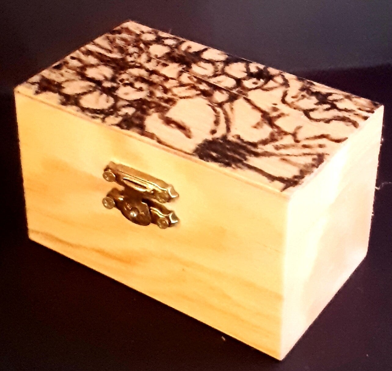 Kistje van hout met aan de bovenzijde een afbeelding van bloemen gebrand.