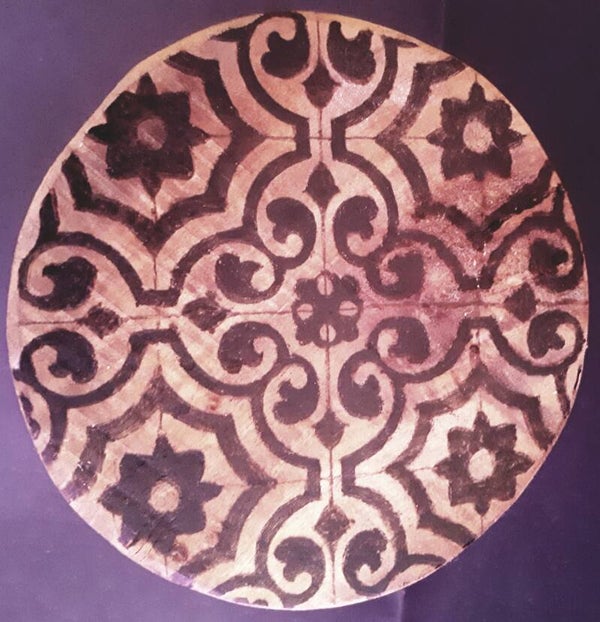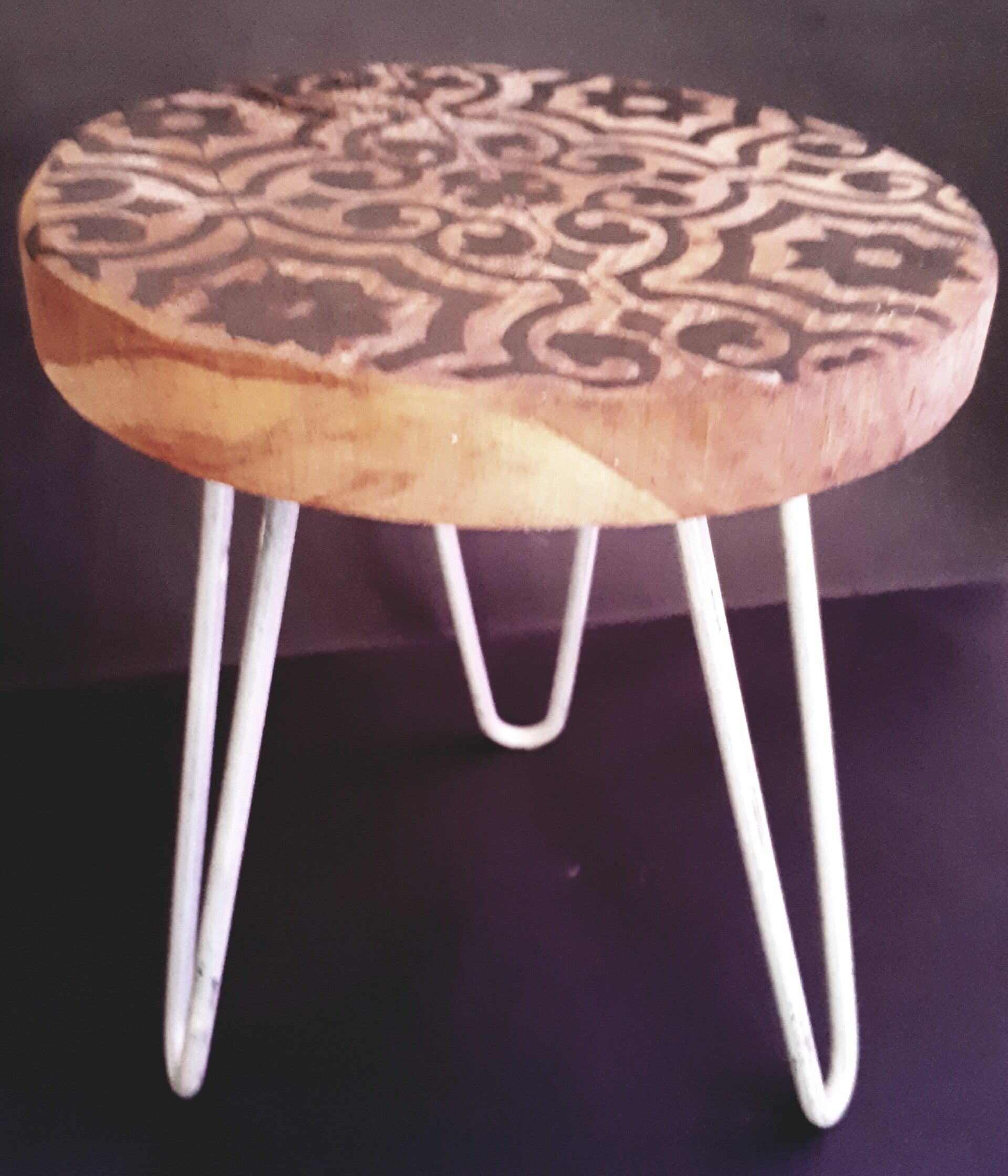 Plantenkrukje met een metalen onderstel en teakhout bovenkant met daarop een patroon van Portugese tegeltjes gebrand.