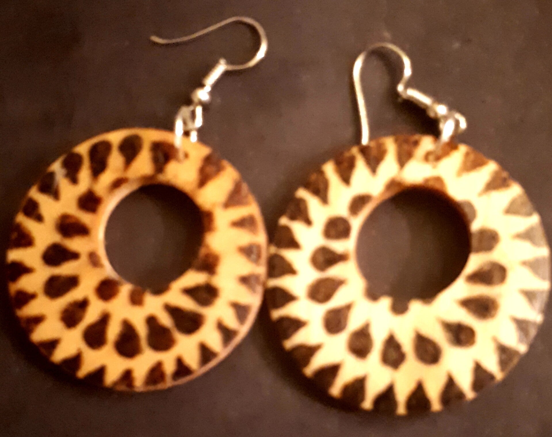Oorbellen van hout met aan beide zijden een patroon gebrand.