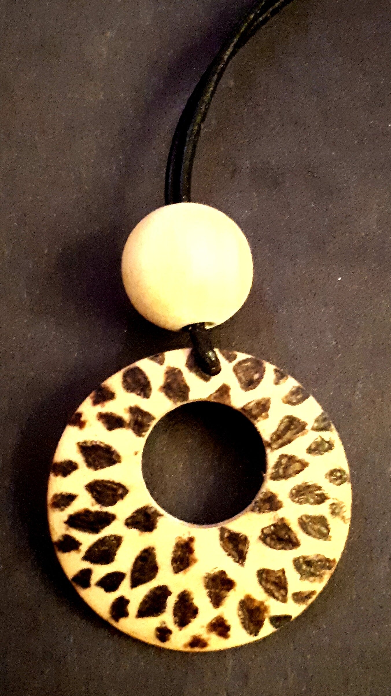 Hanger en kraal van hout, met daarop een bloemenpatroon gebrand. De ketting is van zwart leer. Afmeting hanger ca 4 cm. Lengte ketting is ca 30 cm.