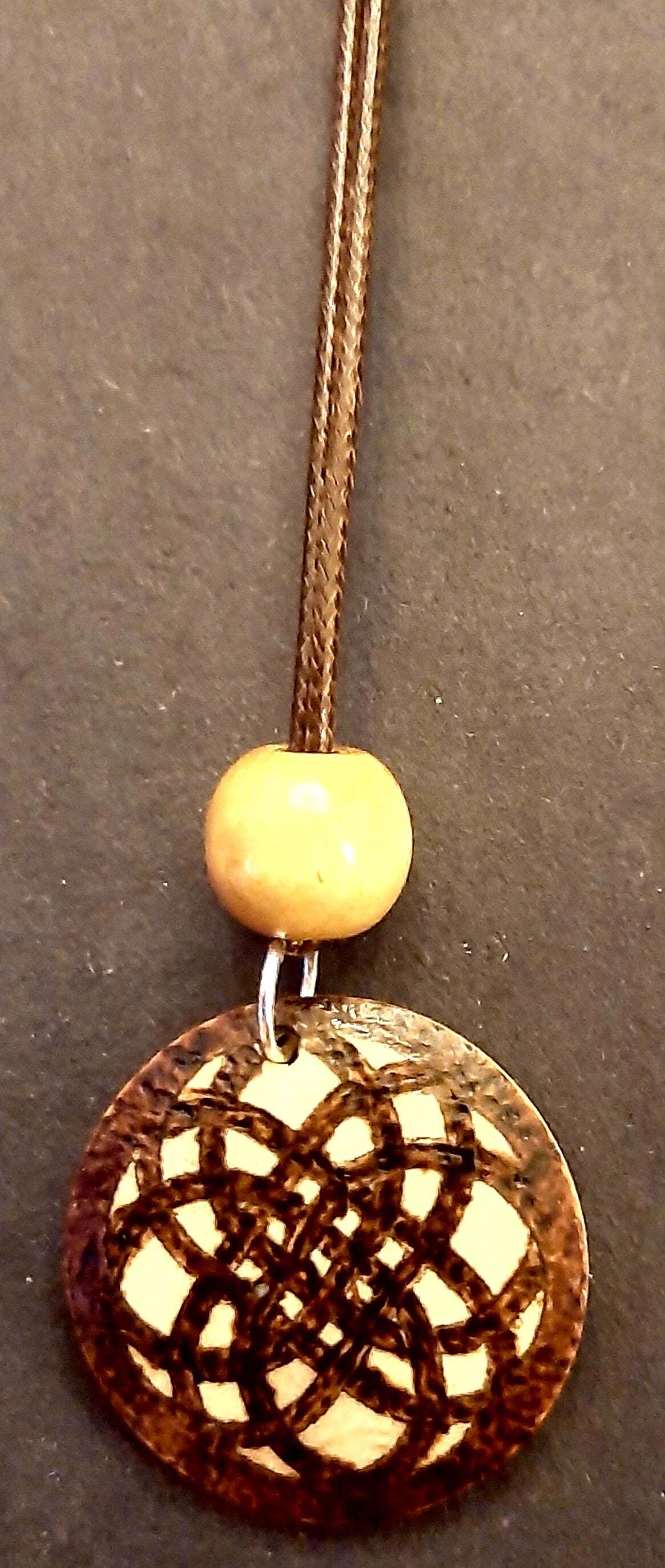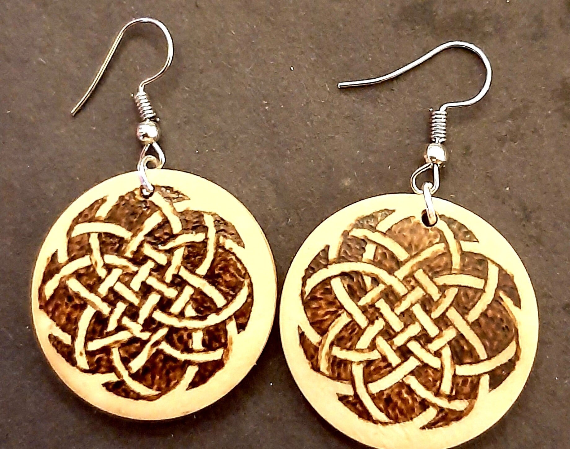 Set bestaande uit oorbellen en een ketting met daarop een Keltische knoop gebrand. De ketting heeft een lengte van ca 20 cm. De oorbellen en hanger hebben een doorsnede van ongeveer 3 cm.