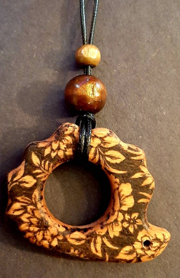 Leuk sieradensetje van hout, bestaande uit een paar oorbellen en een ketting met daarop een bloemenpatroon gebrand.