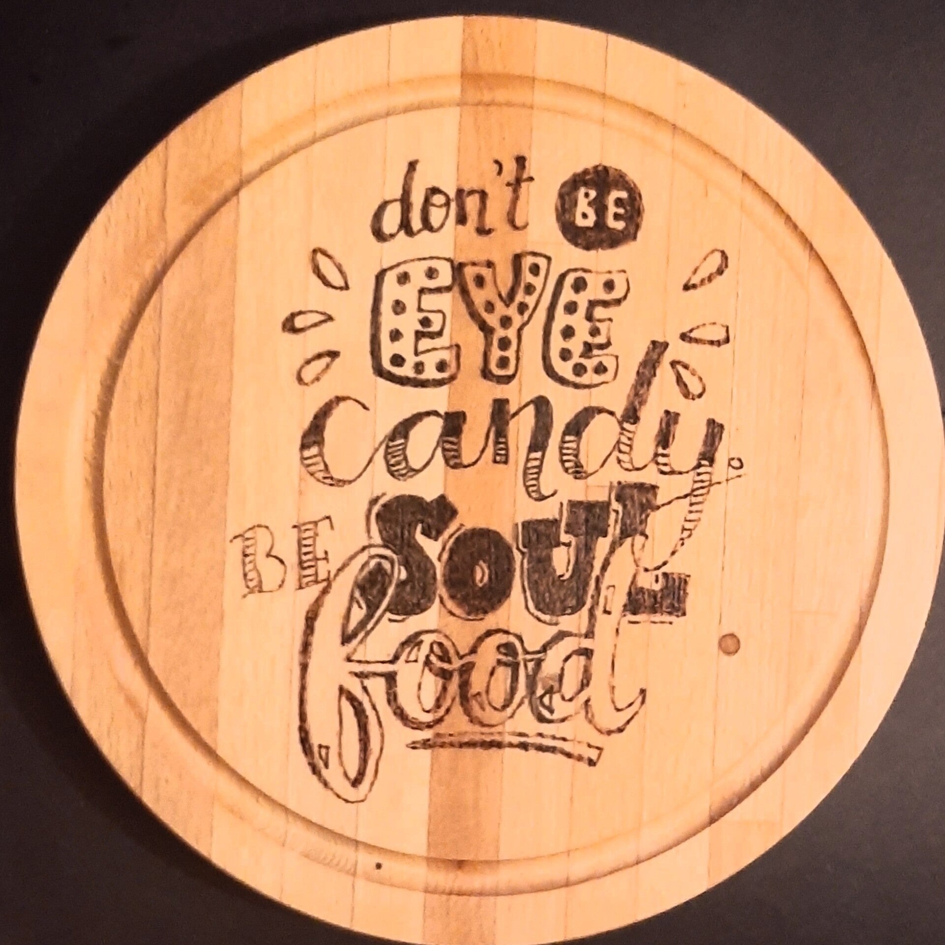 Serveerplank van beuken hout met de tekst Don't be eye candy. Be soul food erop gebrand.