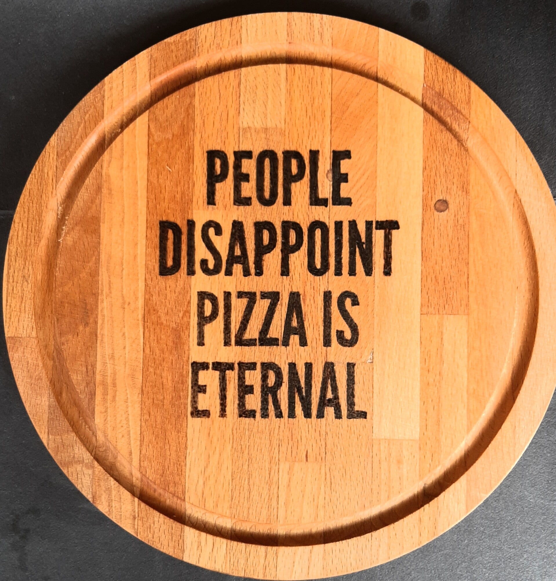Serveerplank van beuken hout met de tekst People disappoint. Pizza is eternal erop gebrand.