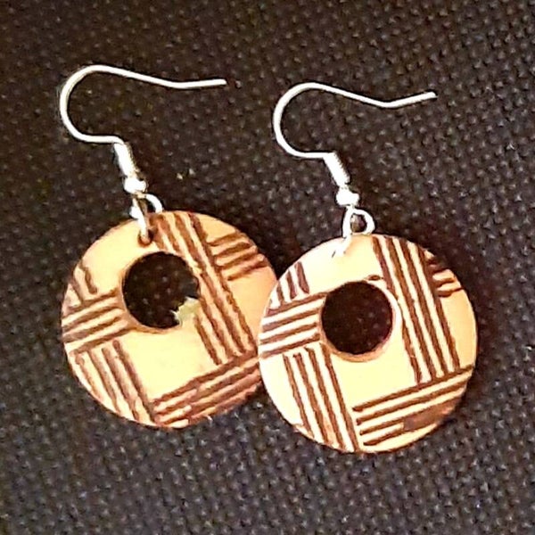 Sieradensetje van hout bestaande uit een ketting een paar oorbellen met daarop een strepen patroon gebrand.
