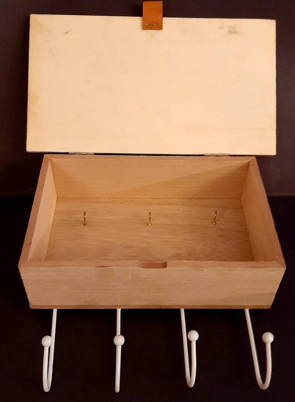 Sleutelkastje van hout, met op de voorkant een zentanglepatroon gebrand. Aan de onderzijde zijn 4 haken bevestigd. Aan de binnenkant zijn er 3 haken om uw sleutels op te hangen.
