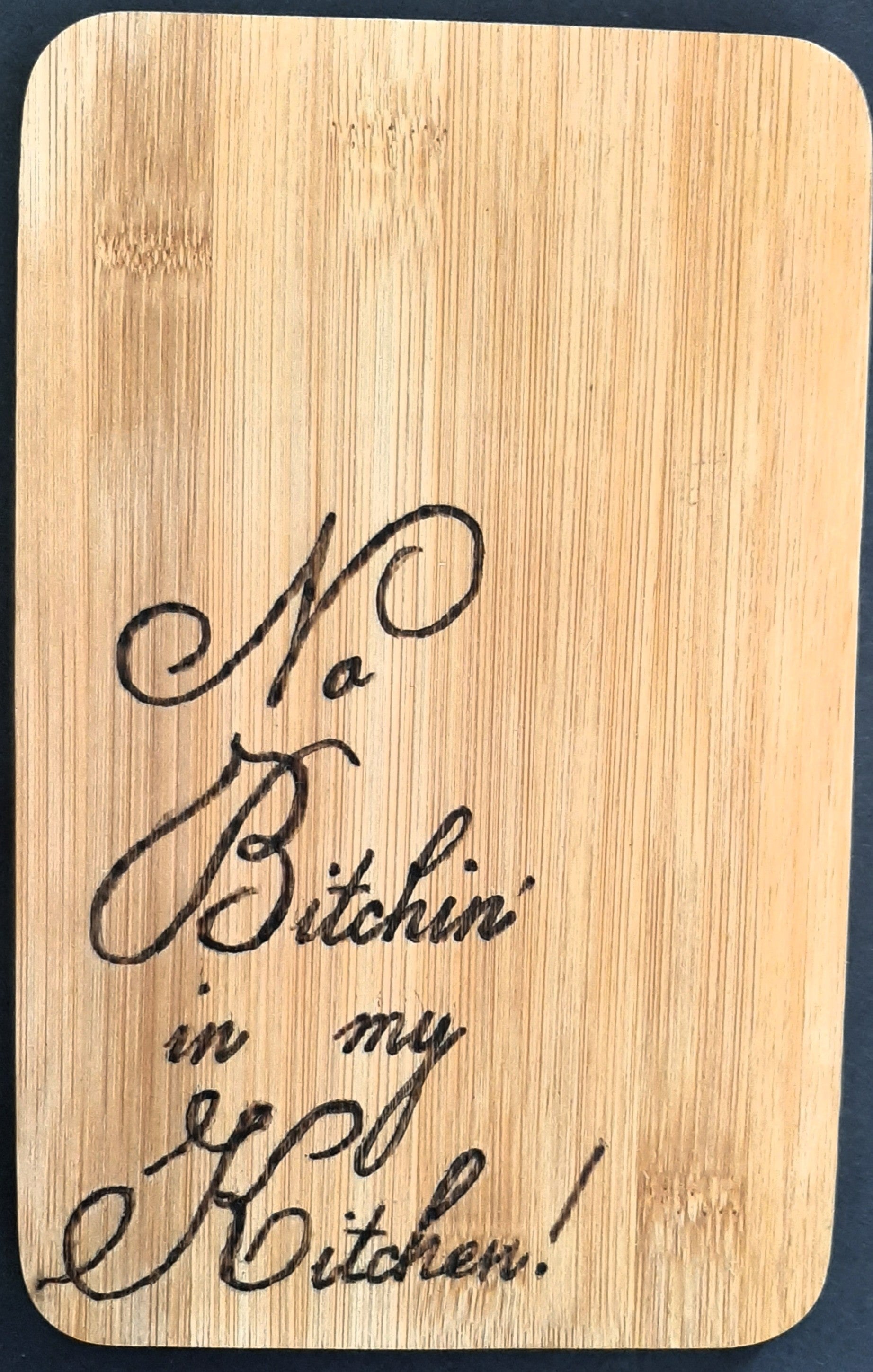 Snij-/serveerplank van bamboehout met de tekst No bitchin' in my kitchen.