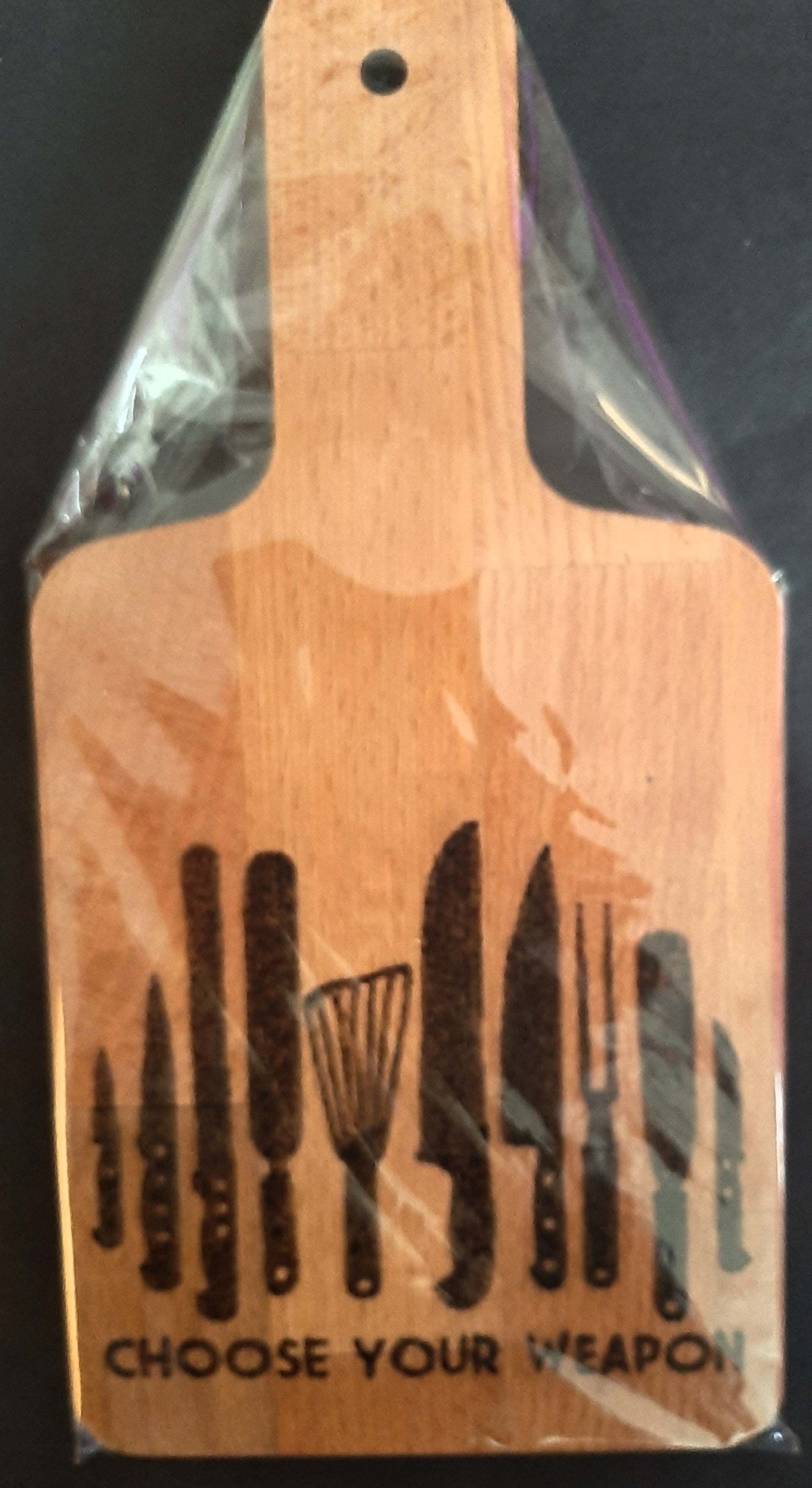 Snij/serveerplank van hout met de tekst Choose your weapon.
