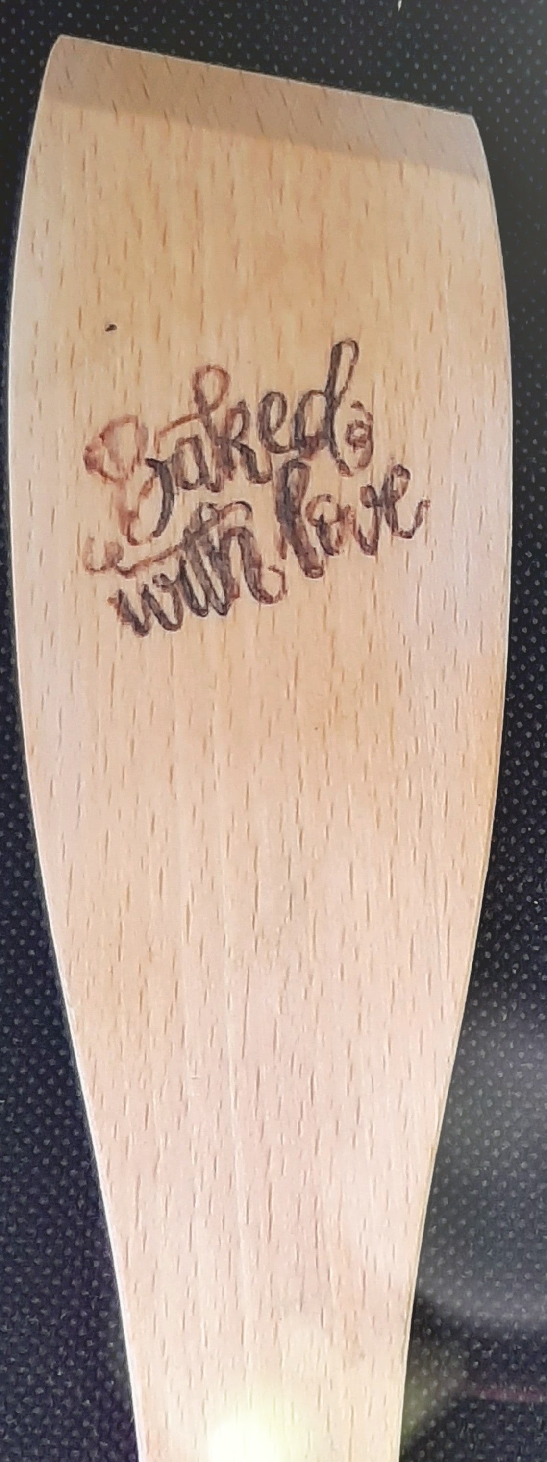 Spatel van hout met de tekst Baked with love erop gebrand.