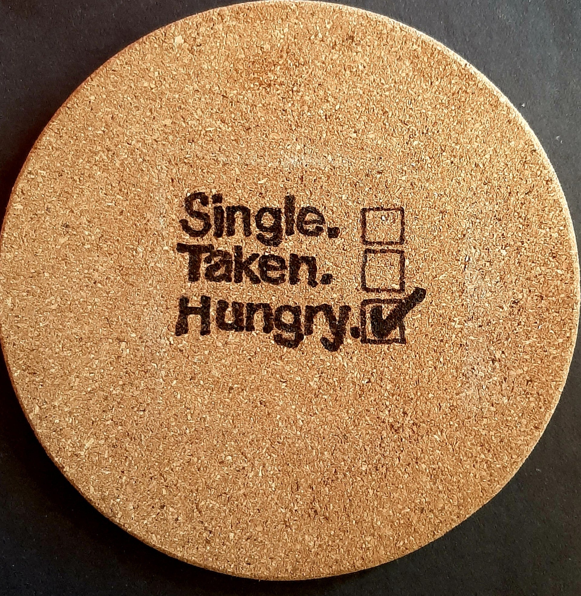 Onderzetter van kurk met een checklist Single, Taken, Hungry.