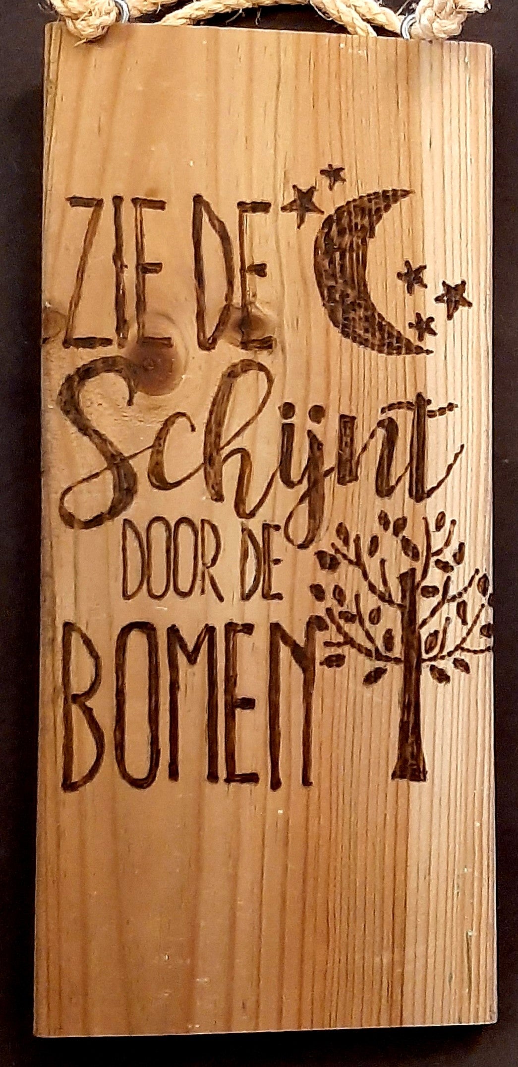 Tekstbord van geïmpregneerd tuinhout, met daarop het liedje Zie de maan schijnt... gebrand. Aan de bovenzijde is een ophangtouw bevestigd.