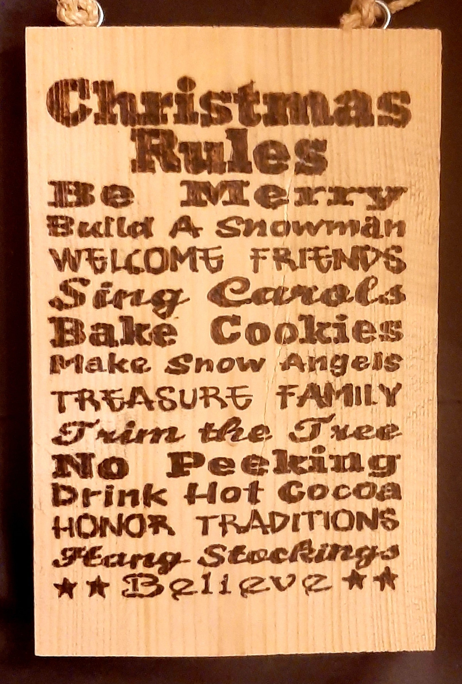 Tekstbord van steigerhout, met daarop een tekst gebrand die toepasselijk is voor de kerst.
