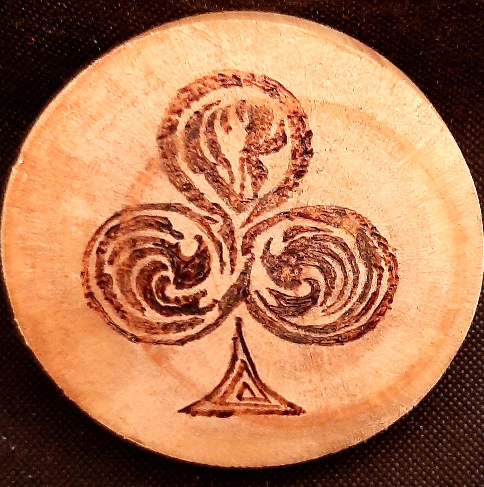 Grote robuuste wandhaak/knop van teakhout met daarop het kaartteken klaver gebrand. Te gebruiken om bijvoorbeeld je jas aan te hangen, of de hondenriem enz.
