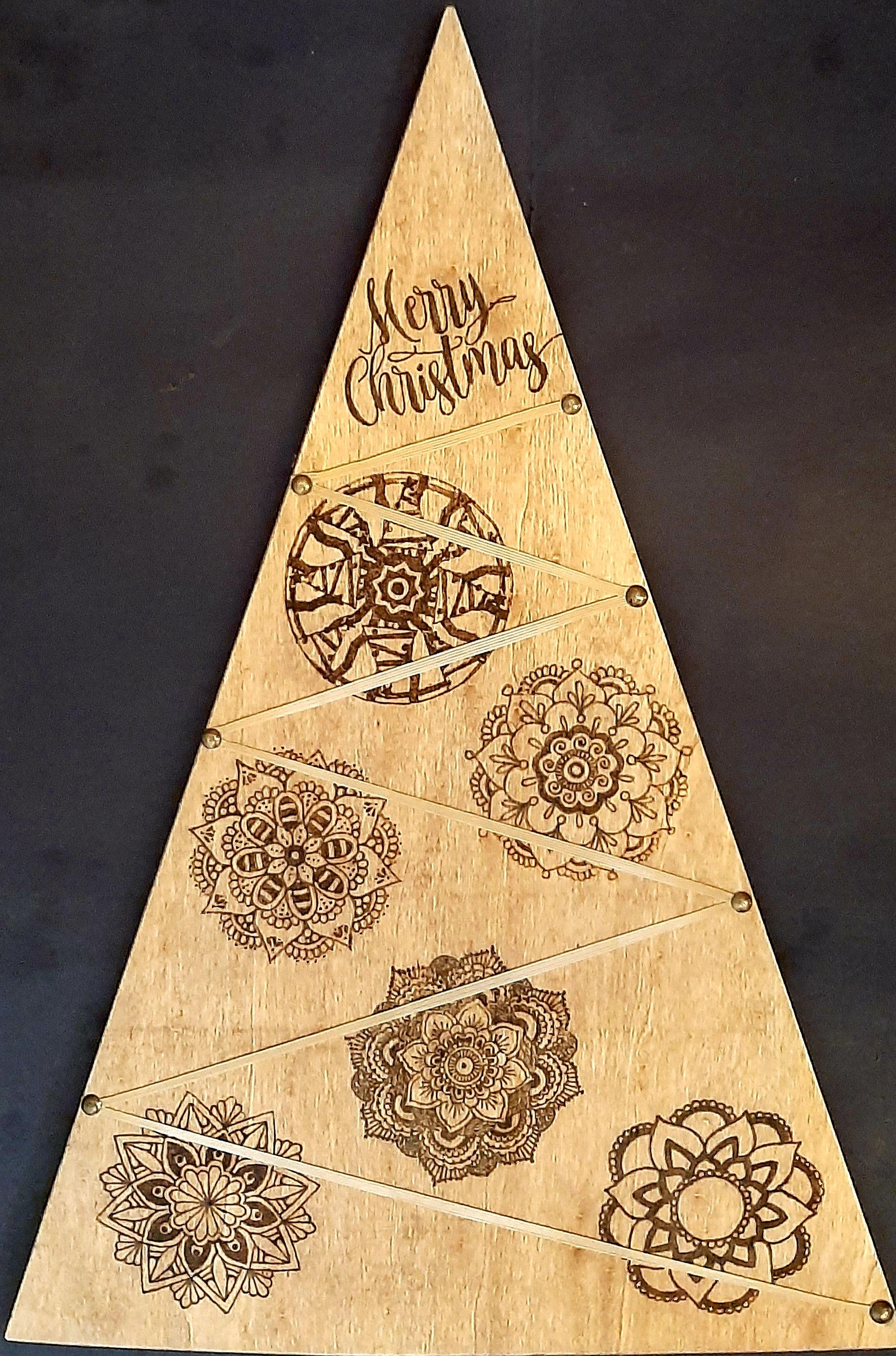 Kerstboom van hout, met daarop kerstdecoratie gebrand. De boom is bedoeld om achter het elastiek uw ontvangen kerstkaarten te doen. Aan de achterzijde is een ophanghaakje bevestigd.